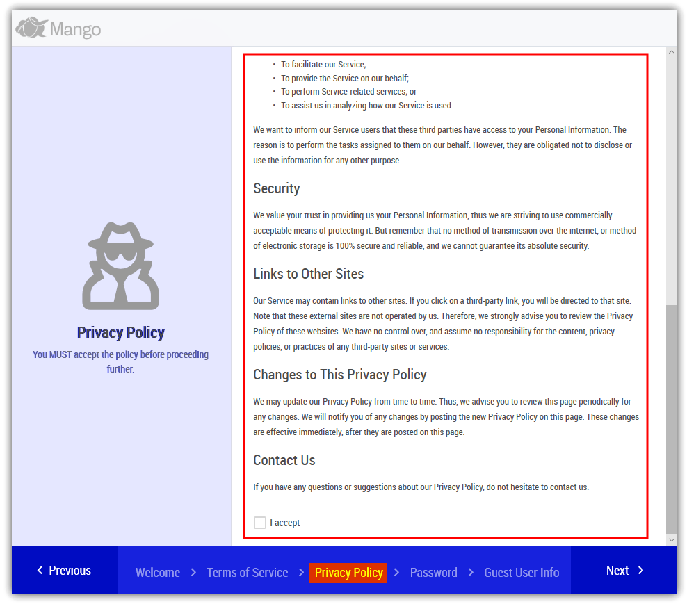 Administrators can configure the Privacy Policy in the[ **Getting Started**](https://guides.mangoapps.com/admin-guide/domain-settings/getting-started/terms-of-service-privacy-policy) tab.