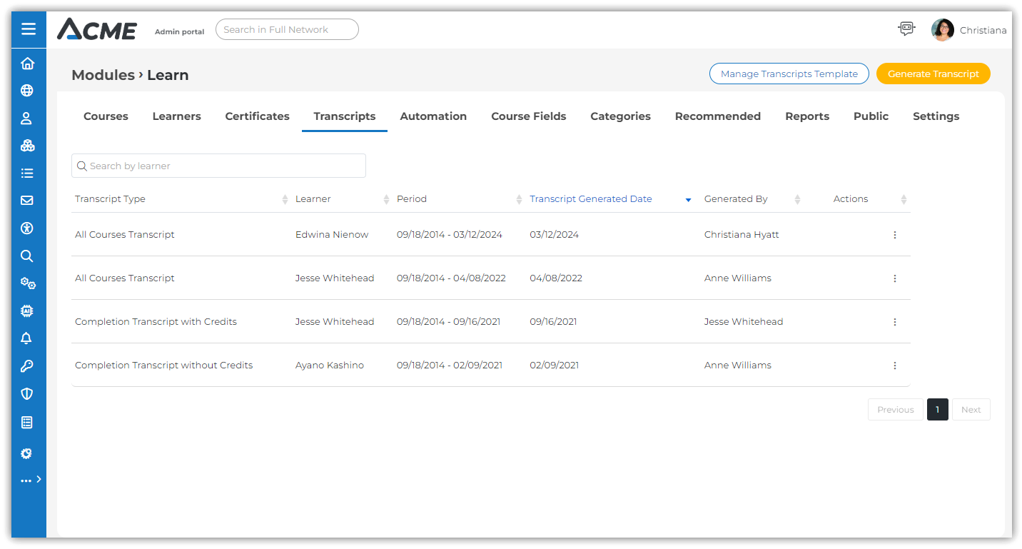 Domain and LMS (Learning Management System) administrators have the capability to generate transcripts for any user. All administrators can view and download transcripts from the **Transcripts** tab in the Learn module within the Admin Portal. Admins can configure transcript notification settings to receive notifications when transcripts are ready. Transcripts include ILT (Instructor-Led Training) courses that meet the specified filter and template type criteria.