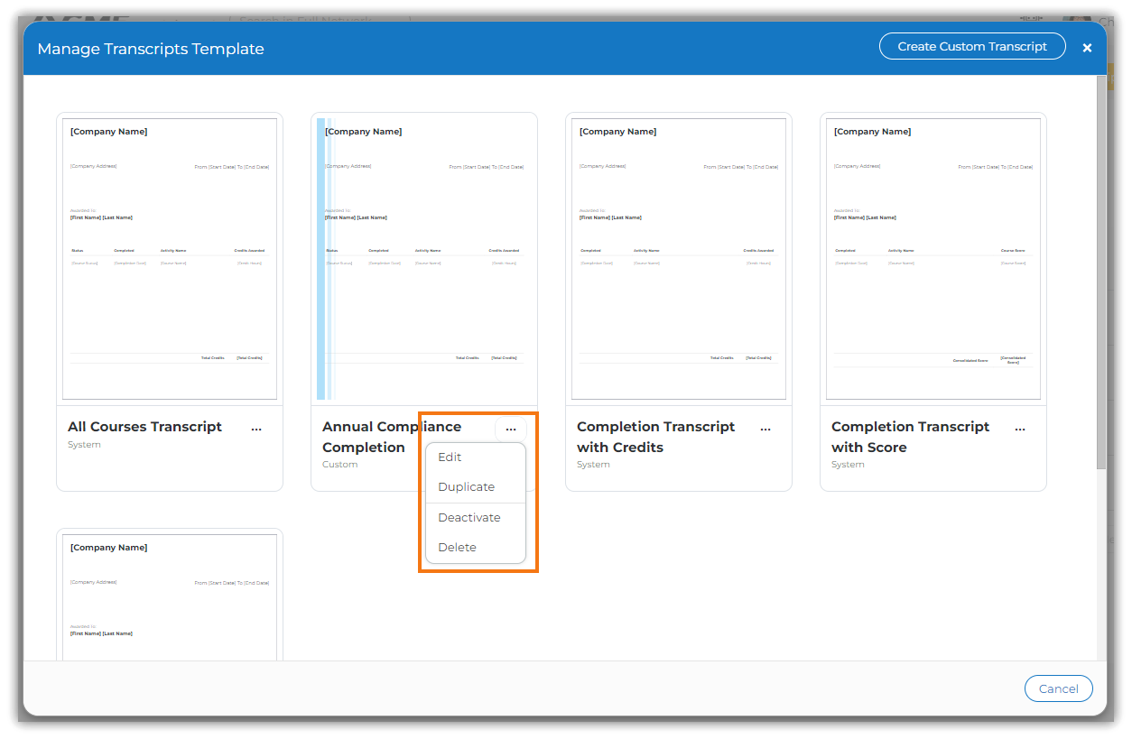 Custom transcript templates can be edited by domain & learn module admins. From the **Manage Transcripts Template** menu, you have the option to edit, duplicate, activate/deactivate, and delete listed templates.&#x20;