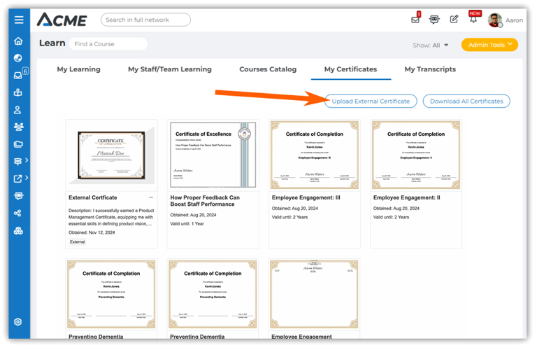 [If enabled](https://guides.mangoapps.com/lms-guide/learn-admin/learn-settings#advanced-options), users will have the option to upload external certificates. <br>