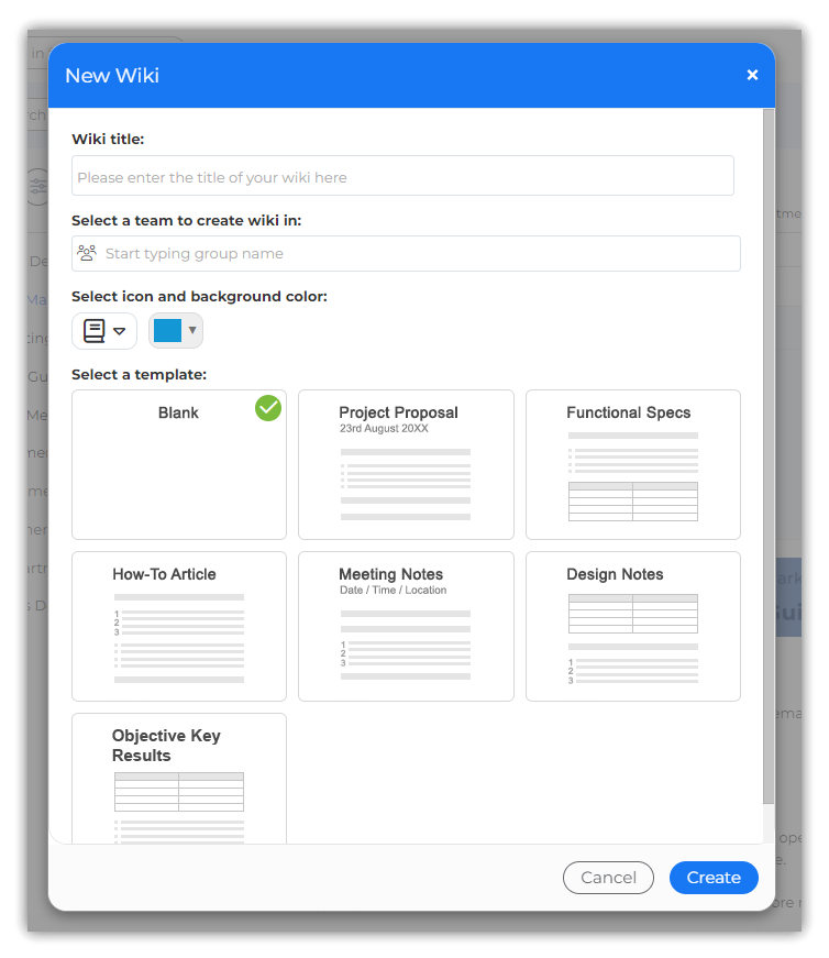 You can create a blank wiki or use an out-of-the-box template to start. Each wiki MUST be created in a group.