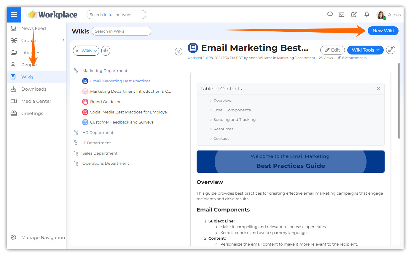 Click the New Wiki button in the Wikis page to open the New Wiki pop-up. Alternatively, in a team's page, click the More drop-down list in the News Feed tab and then click the New Wiki option. Another way to get started is to also click the New Wiki button in a team's page in the Wikis tab to open the New Wiki pop-up.