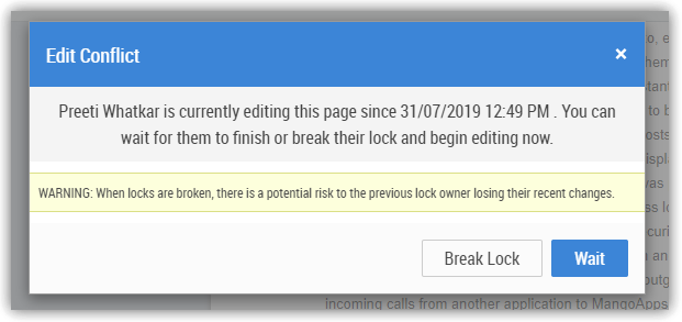 Wikis are intended to be collaborative. Team members can edit the wiki created and published by you. MangoApps Wikis employ page-locking, so that only one person may edit a page at a time. If more than one person attempts to edit a page that is already being edited, they receive an alert message similar to: